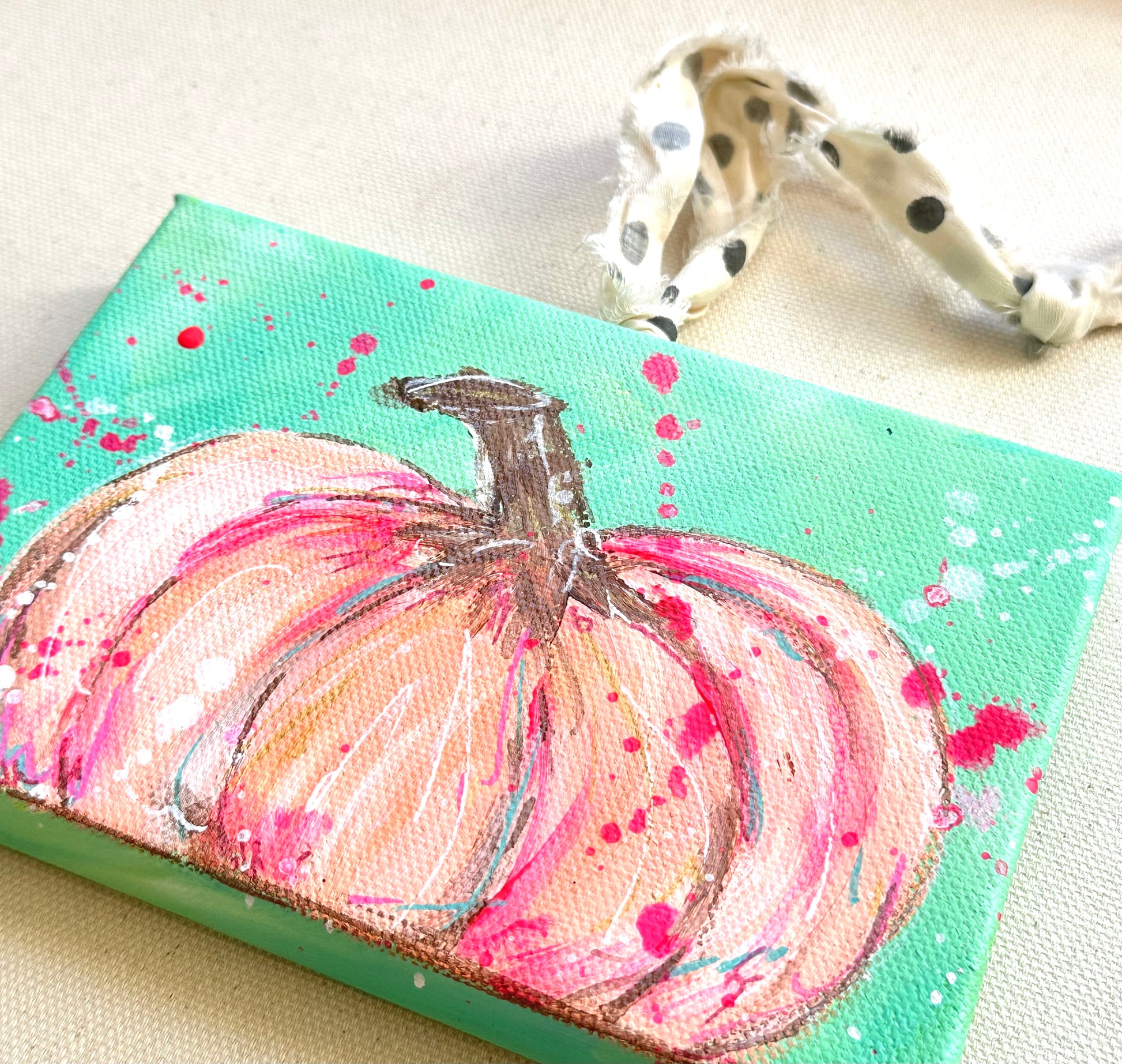 The popular canvas ornaments are back! This whimsical pink and orange princess pumpkin is ready to adorn your home with a bright touch of whimsy. It can hang anywhere to add Autumn fun anywhere in your home.
