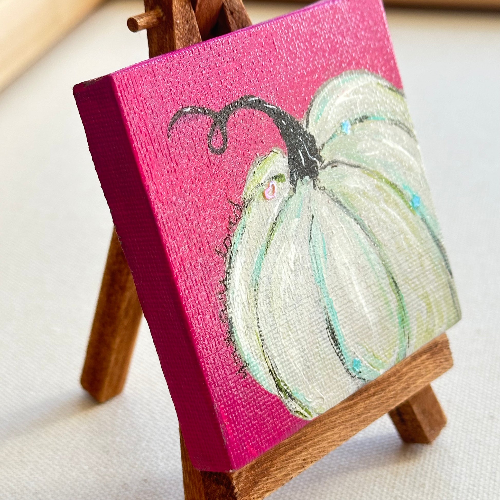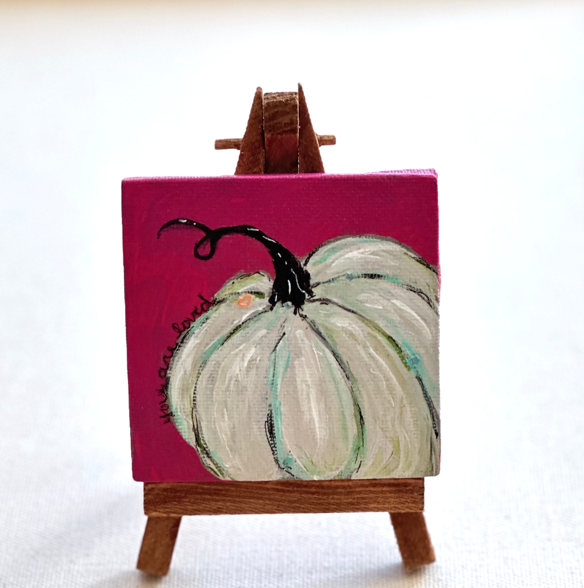 Grab this limited mini canvas with an easel before it's gone. My favorite white and teal pumpkin on a bold magenta background. A lovely reminder that You are Loved!